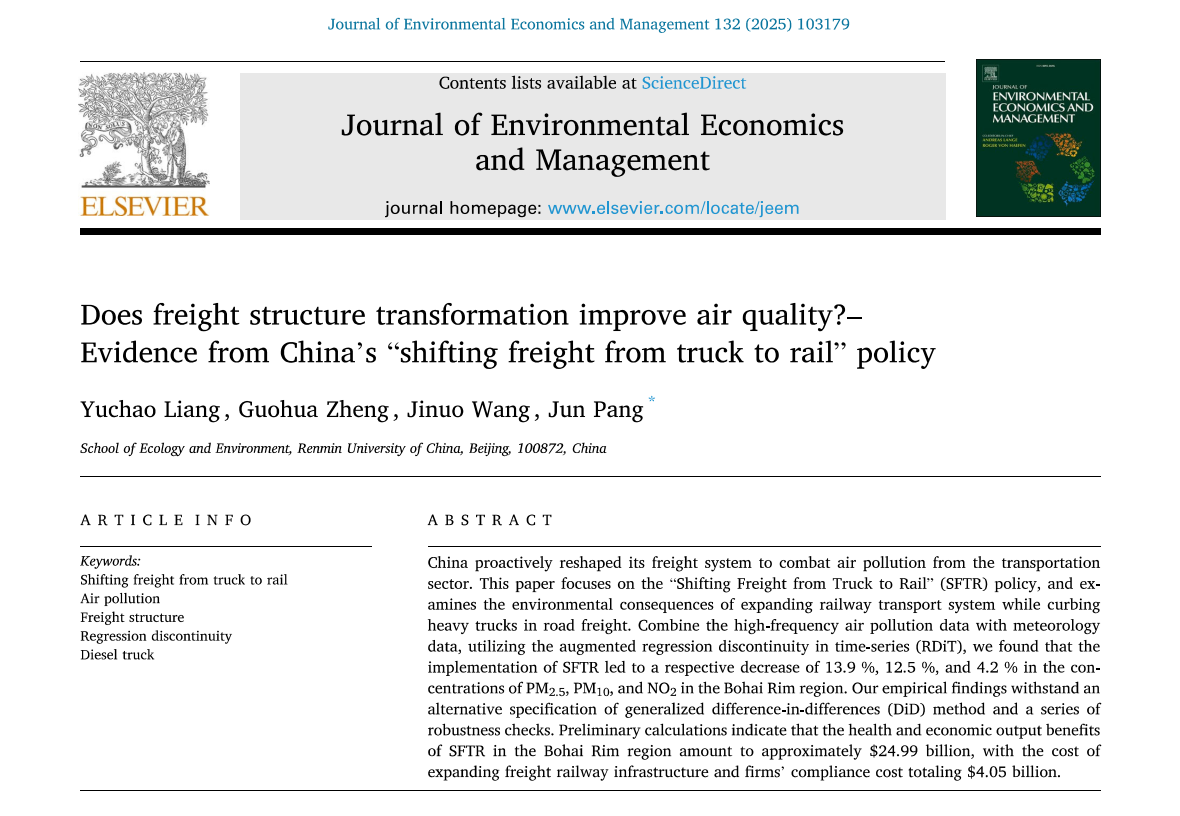 近日,生态环境学院2022级博士研究生梁宇超同学在资源与环境经济学领域国际顶级期刊Journal of Environmental Economics and ManagementJEEM)在线发表学术论文。该论文题为“Does freight structure transformation improve air quality?–Evidence from China's ‘shifting freight from truck to rail’ policy”。论文全体作者均来自于中国人民大学生态环境学院,人口、资源与环境经济学2022级博士研究生梁宇超为第一作者,论文合作者包括生态环境学院2021级明德环境经济学-科学拔尖人才实验班的本科生郑国华同学和王吉诺同学,生态环境学院庞军教授为论文通讯作者。本论文前后经历两轮匿名评审,共计超过20条评审意见,对审稿意见的回应超过2万字,从投稿、两次返修到在线发表共历时15个月时间。