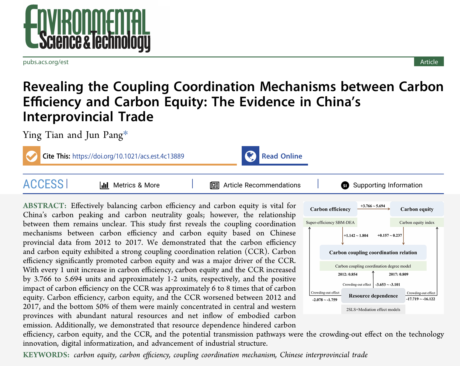 近日,中国人民大学生态环境学院庞军教授课题组在环境领域顶级期刊Environmental Science & Technology发表题为“Revealing the Coupling Coordination Mechanisms between Carbon Efficiency and Carbon Equity: The Evidences in China’s Interprovincial Trade”的学术论文。生态环境学院2021级人口、资源与环境经济学博士田颖为第一作者,庞军教授为通讯作者。