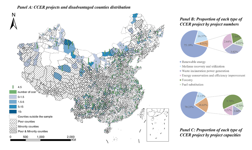 该研究基于县级面板数据,构建CSDID模型和三重差分模型评估了中国核证自愿减排量(CCER)对空气污染与环境公正的影响。结果显示,CCER建设使县级二氧化碳排放下降2.89%、PM₂.₅浓度下降2.13%;同时,CCER建设能够使经济不发达县与少数民族县的PM₂.₅浓度分别额外下降2.05%与3.34%。进一步分析显示,可再生能源类项目带来的改善效果更为显著,而绿色投资与绿色创新水平是其发挥作用的主要机制。