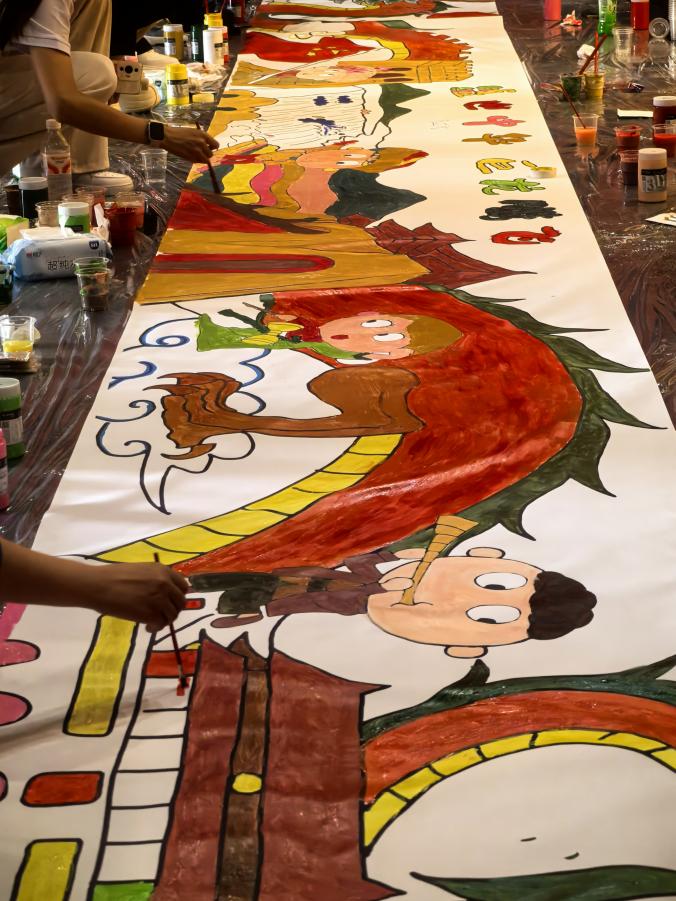 实践团前往鄂尔多斯文化产业园参观调研,并观摩《凤鸣九曲》大型民族主题表演。舞者以巨型鼓面为舞台,伴随恢弘鼓乐腾跃起舞,通过动态视听语言再现鄂尔多斯“神鸟降临”的神话史诗,展现北疆大地生态与人文交融的壮丽图景。剧中“凤凰浴火重生”的意象,更隐喻着草原民族坚韧不息的精神传承。 鼓乐与群舞的交响,不仅是艺术盛宴,更是传统文化生命力的澎湃表达。在文化产业园调研时,实践团还与来自重庆的100名青少年齐聚文化产业园,共同完成“各民族同画一幅画”主题活动。蒙汉双语志愿者引导两地青年分组协作,以“中华巨龙腾飞”为主题创作长卷。一幅幅充满想象力的笔触,勾勒出各族青少年对民族交融、山河一体的美好憧憬。