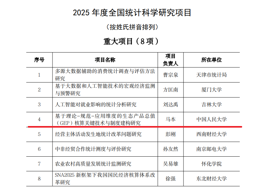 近日,国家统计局公布了2025年度全国统计科学研究项目立项名单,我院马本副教授申报的课题“基于理论-规范-应用维度的生态产品总值(GEP)核算关键技术与制度建构研究”获得重大项目立项资助。
