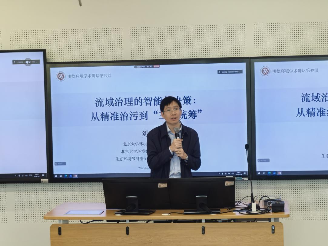 2025年11月1日,中国人民大学生态环境学院主办的“明德环境学术讲坛”第四十九讲以线上线下结合、通州校区与中关村校区同时进行的方式成功举办。本次讲坛邀请北京大学博雅特聘教授、环境科学与工程学院院长、青藏高原研究院副院长、环境智能交叉研究中心主任刘永教授来到中国人民大学通州校区作了题为“流域治理的智能化决策:从‘精准治污’到‘三水统筹’”的学术报告。中国人民大学生态环境学院副院长昌敦虎教授主持会议并首先致辞,代表学院对刘永教授为我院师生作学术报告表示诚挚感谢,并对参会师生在交流学习过程中能够有所收获提出了殷切期望。