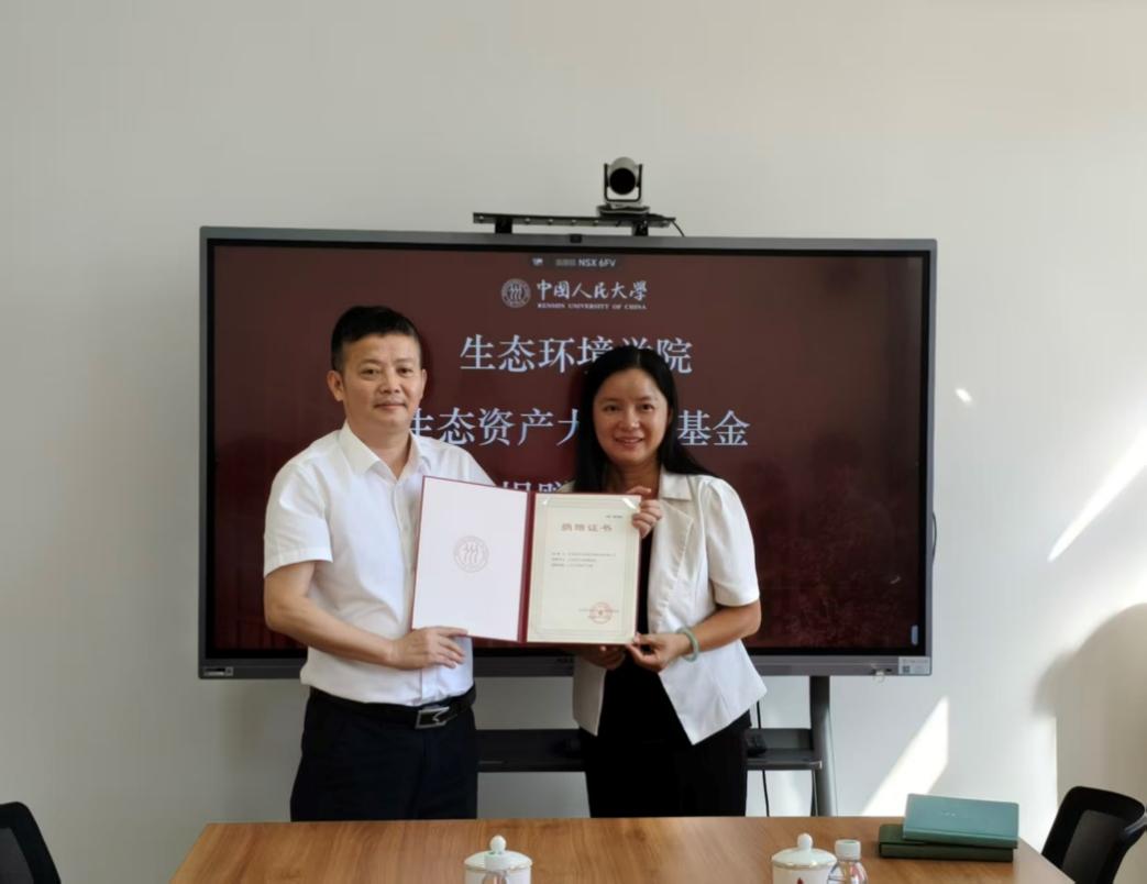 2025年9月18日下午,中国人民大学生态环境学院“生态资产大数据基金”捐赠仪式顺利举行。此次捐赠仪式的举办,旨在凝聚社会力量支持我院生态资产大数据领域的学科建设与科研创新,为生态环境学科高质量发展注入新活力。北京隆科兴科技集团股份有限公司副总裁杨孝安、财务总监沈萍,中国人民大学教育基金会副秘书长陈蓝蓝,生态环境学院院长庞军、党委书记贾铁英、党委副书记兼纪委书记于媛、生态资产大数据实验室主任梅应丹、生态与环境经济学系主任马本、助理教授严冬等出席仪式。捐赠仪式由于媛副书记主持。