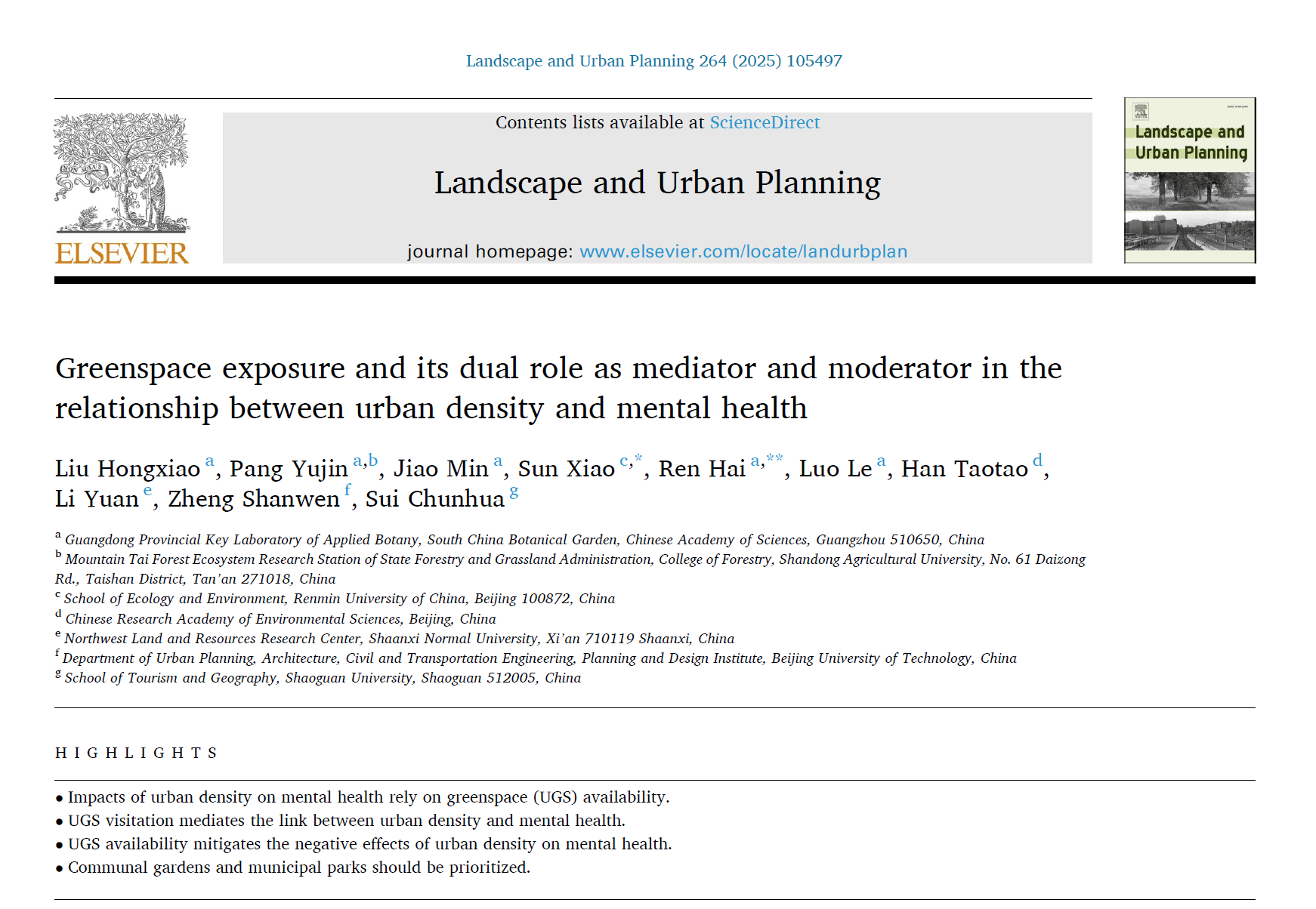 近日,中国人民大学生态环境学院孙晓副教授作为通讯作者,与合作者的研究论文“Greenspace exposure and its dual role as mediator and moderator in the relationship between urban density and mental health”在景观生态学及城市规划领域国际顶级期刊Landscape and Urban Planning发表。
